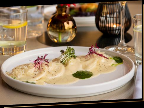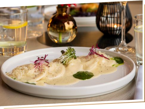 Our Ravioli with ricotta, sage beurre blanc with parmesan, spinach oil