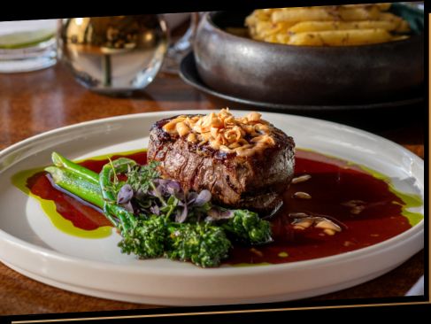Beef tenderloin steak, foie gras, wild broccoli, Madeira sauce, truffles French fries