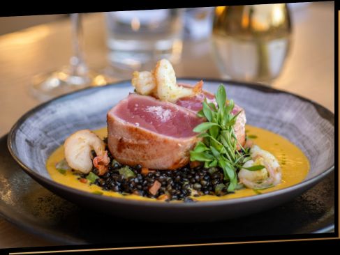 Tuna fish fillet, shrimp, beluga lentils with crispy vegetables, red curry sauce, coriander