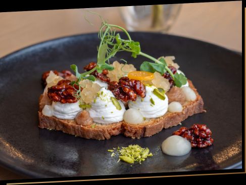 Foie gras parfait, cherry gel, nuts, toasted sourdough bread